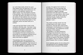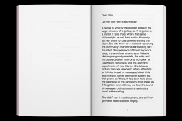 The volume is an epistolary narrative produced via text message with a community of anonymous correspondents. Following on from a performative work, conceived by Simon Asencio, this book stages a relation between two protagonists, U and I. Through identitarian slips and glyphs, the book explores the narrative ambiguities of experimental writing, to generate a space for fluidity and uncertainty, at the intersection of the artistic and the literary.